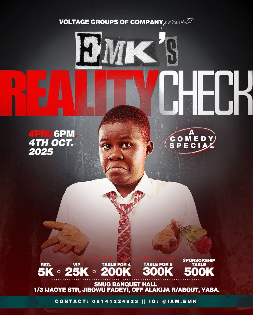 Emk’s Reality Check is more than a performance; it’s a mirror held up to life’s truths, struggles, and unfiltered realities. Through powerful storytelling, raw emotions, and thought-provoking expression. This isn’t just art, it’s an experience, a wake-up call, and a deep dive into the human condition. Come ready to laugh, reflect, and connect with the power of realness. Don’t just watch, feel it. Ticket from N5,000.