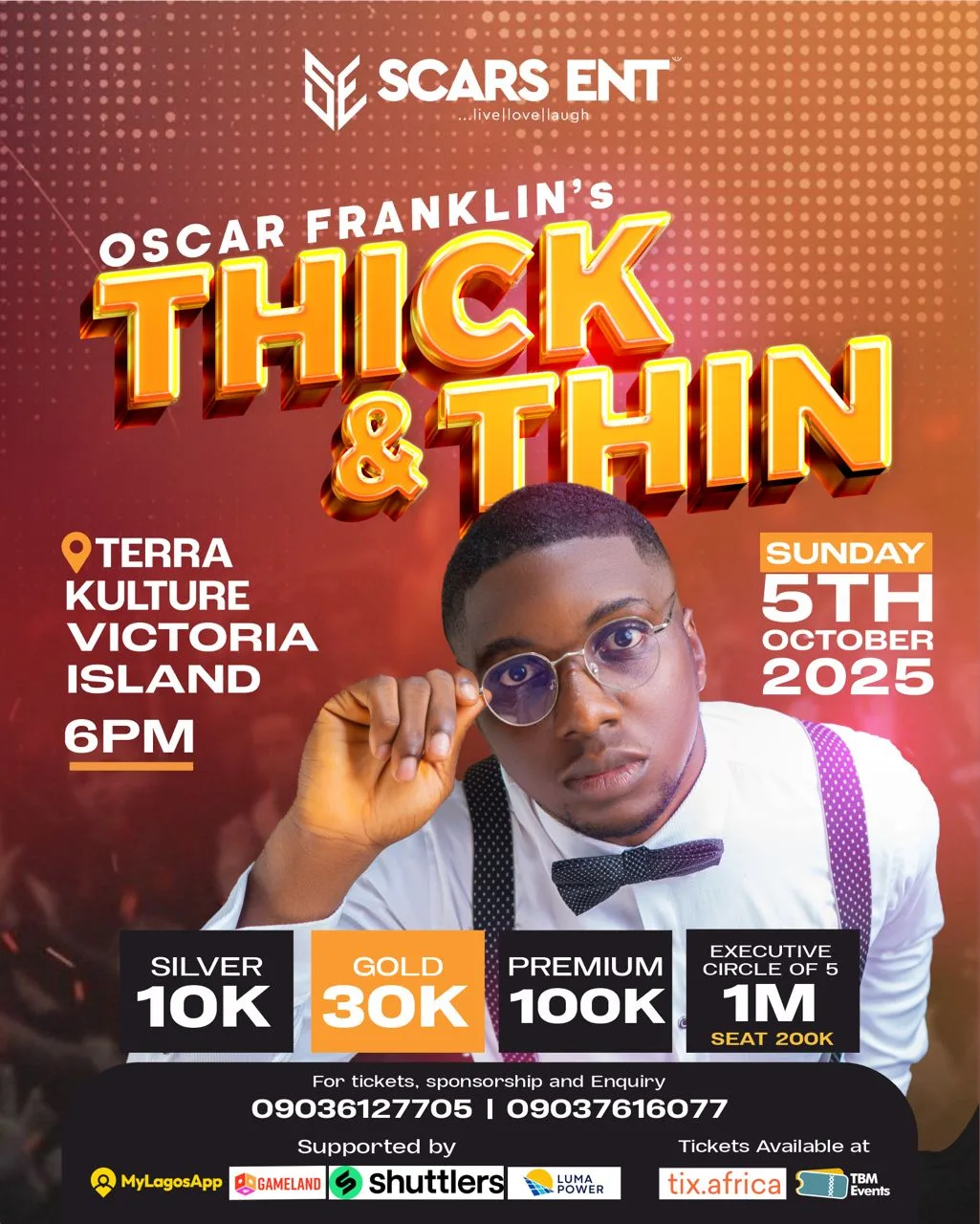 Oscar Franklin’s Thick & Thin is a captivating stage performance that dives into the complexities of love, loyalty, and the unspoken struggles of relationships. With raw storytelling, emotional depth, and powerful acting, Oscar Franklin brings to life a tale that explores the bonds that hold us together — and the secrets that pull us apart. This isn’t just theatre; it’s an intimate journey through passion, sacrifice, and resilience. Whether you come for the drama, the laughter, or the heartache, you’ll leave deeply moved. Don’t miss this unforgettable performance. Ticket from N10,000.