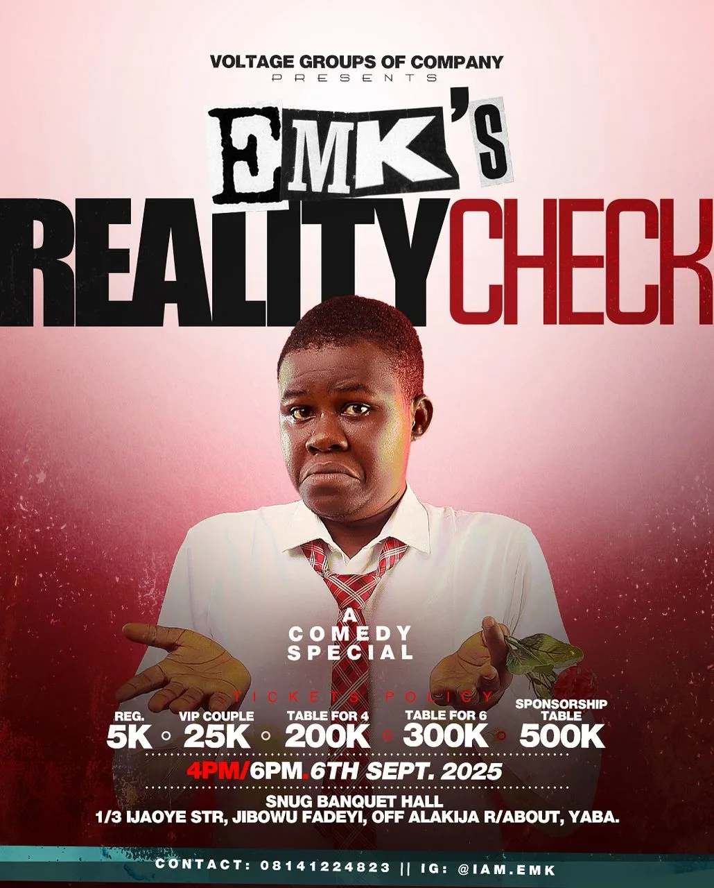 Join the witty and relatable comedian Emk as he takes you on a wild ride through life’s struggles, love, family, and everything in between. No topic is off-limits as he dishes out a much-needed reality check with his unique brand of humor. This isn’t just a comedy show; it’s a full-on vibe fest where you’ll be laughing all the way home. Ticket from N5,000