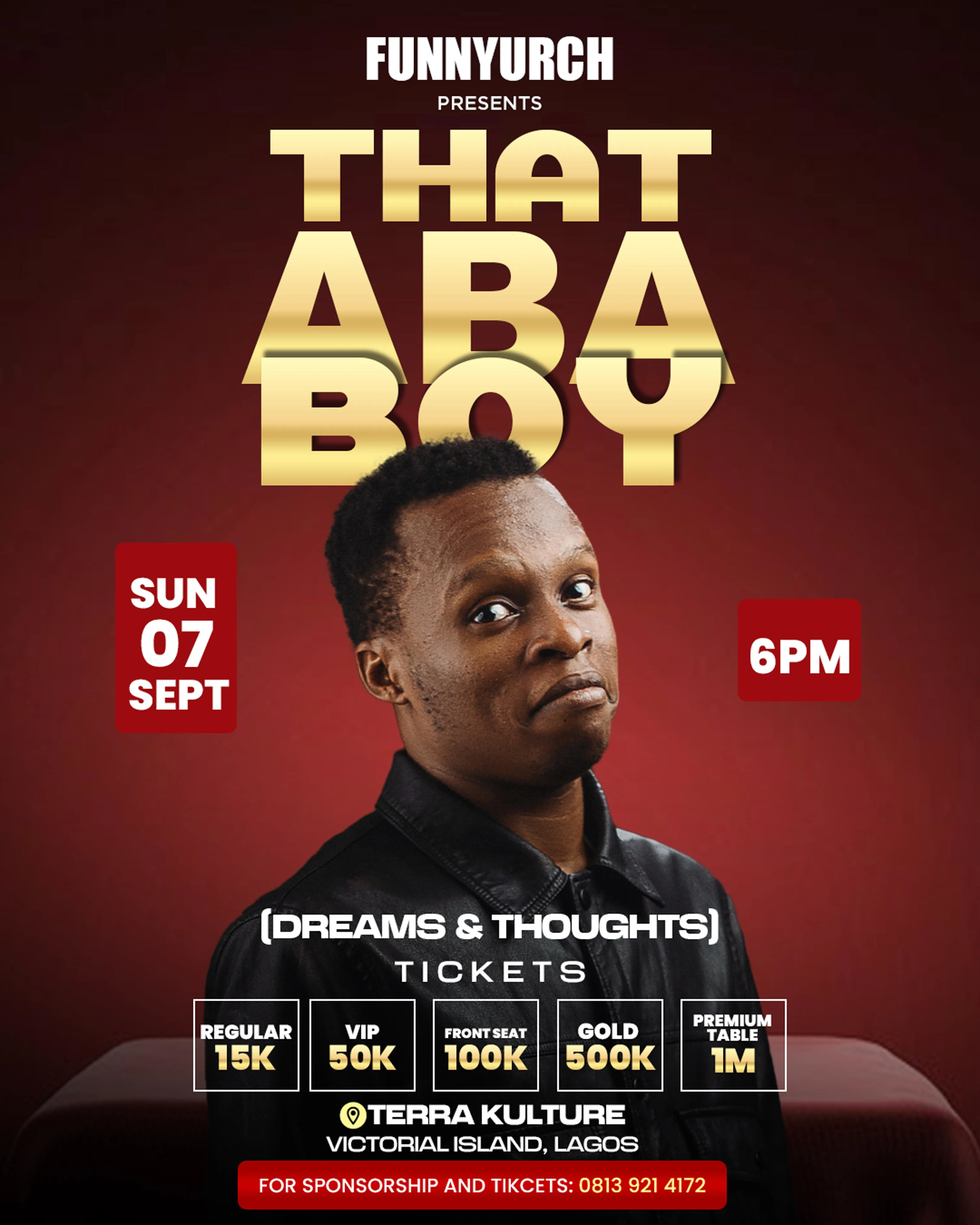 Step into the world of That Aba Boy, a powerful storytelling performance blending drama, music, and raw emotion. This show explores ambition, identity, struggles, and triumphs through the lens of Aba’s vibrant culture and spirit. Expect laughter, reflection, and moments that will stir your soul as dreams meet reality on stage. It’s more than entertainment; it’s an artistic journey of thoughts, resilience, and hope. Don’t miss this cultural experience that celebrates voices from the streets to the spotlight. Ticket from N15,000.