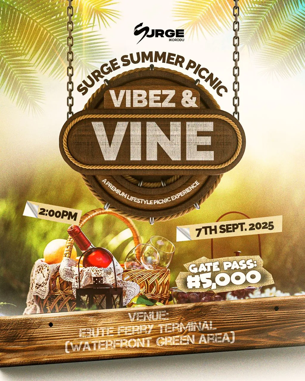 Summer is here, and the vibes are endless. Join the Vibez & Vine – Surge Summer Picnic, a refreshing outdoor escape where music, food, and laughter flow as freely as the wine. Picture the perfect picnic scene: good food, chilled drinks, cozy mats, and a summer playlist that keeps the energy alive. From games to great conversations, this is where new friendships are sparked and unforgettable memories are made. Come with your crew, your vibe, and your best summer fit, it’s all about sunshine, rhythm, and connection. Gate Pass: N5,000.