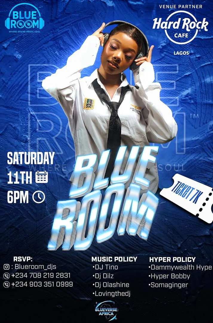 Blue Room — Step into the ultimate weekly DJ and youth culture experience powered by BlueVerse Africa. Blue Room transforms into a sonic playground where Lagos’ finest DJs, creators, and music lovers connect under one vibrant roof.It’s more than a party — it’s a movement of sound, culture, and connection. Expect electric mixes of Afrobeats, Amapiano, House, and Hip-Hop, pulsating energy, and a crowd that lives for rhythm. Feel the vibe. Welcome to Blue Room. Ticket: N7,000.