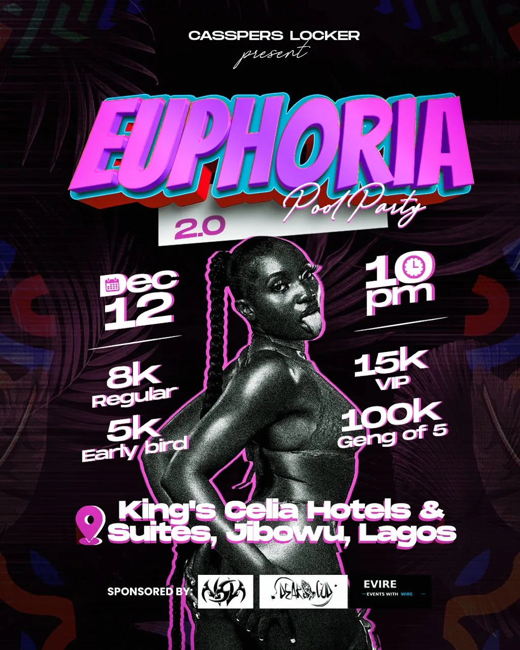Feel the vibes and elevate your senses at Euphoria Pool Party 2.0 — the ultimate celebration of music, energy, and unforgettable moments. This high-octane event promises electrifying DJ sets, live performances, immersive visuals, and a crowd ready to turn up. Perfect for party lovers, music enthusiasts, and social butterflies, Euphoria Pool Party 2.0 guarantees nonstop fun, dance, and memories that last a lifetime. Whether you’re coming with friends or flying solo, this is the place to experience euphoric energy, vibrant vibes, and the ultimate Lagos nightlife experience. Tickets from N5,000.
