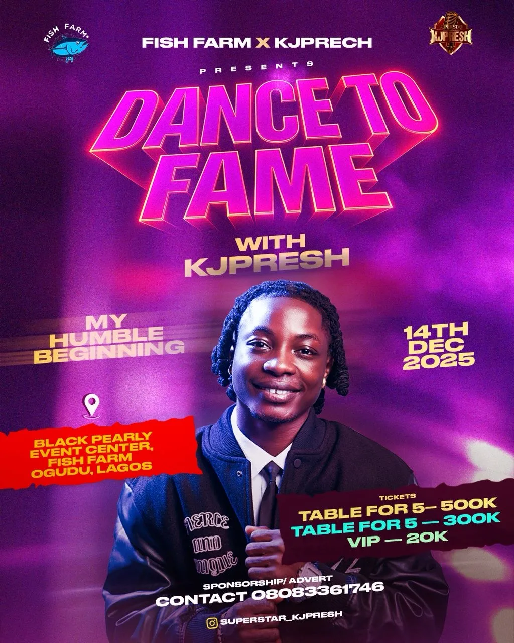 Step into the spotlight at Dance To Fame With Kjpresh: My Humble Beginning (Season 2) — the ultimate dance competition celebrating talent, passion, and determination. Watch as aspiring dancers battle it out with electrifying moves, creativity, and stage presence, guided and inspired by Kjpresh. This season promises intense performances, mentorship, and unforgettable moments as contestants chase their dreams of fame. Perfect for dance enthusiasts, culture lovers, and families looking for entertainment, this event blends artistry, energy, and community. Don’t miss your chance to witness the next generation of dance stars rise on stage. Tickets from N20,000.