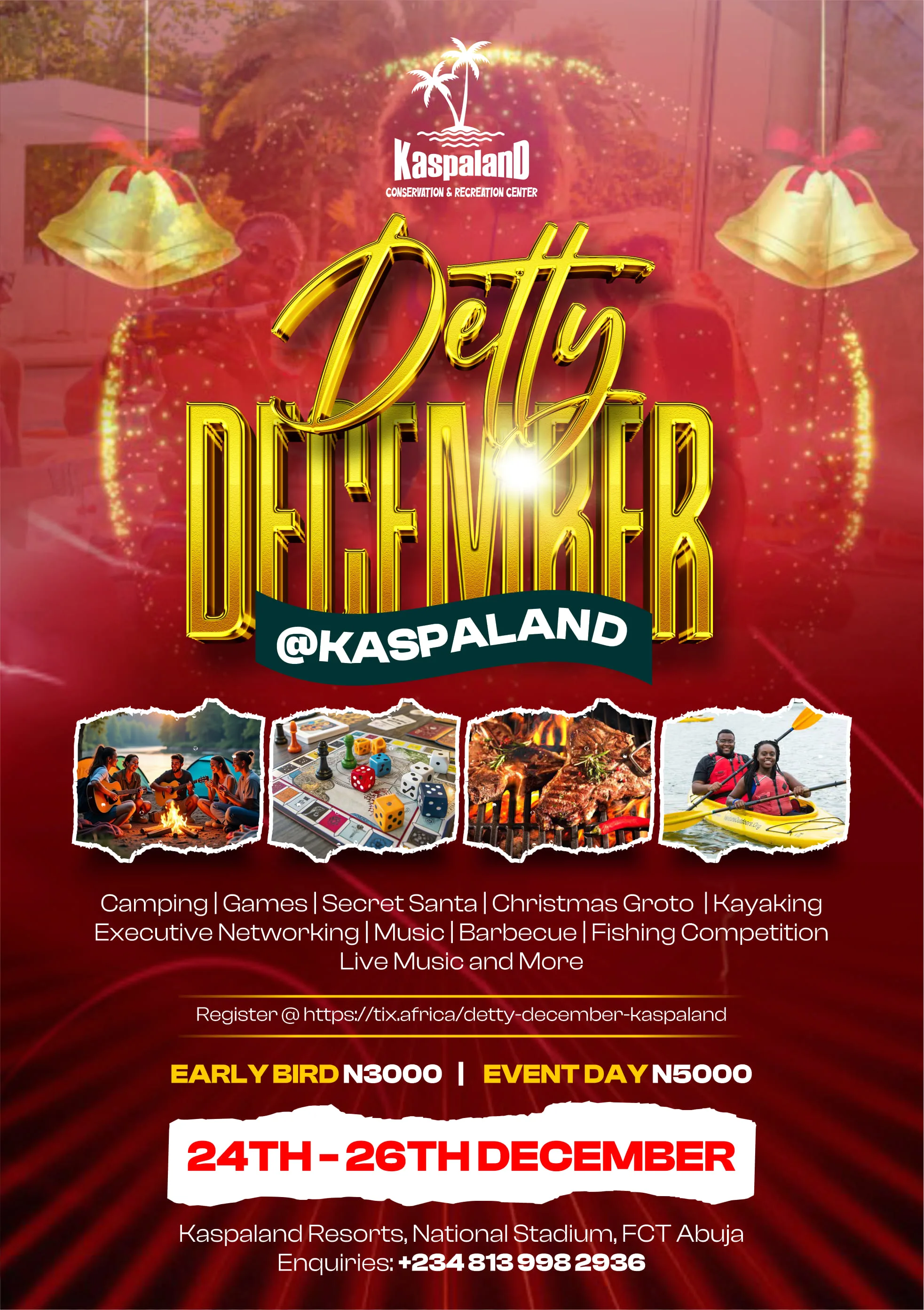 Step into the ultimate festive vibes at Detty December @ Kaspaland — Abuja’s hottest end-of-year party. Expect electrifying DJ sets, live performances, immersive visuals, and a crowd ready to dance, connect, and celebrate in bold style. From pulsating beats to unforgettable moments, this event brings together music lovers, party enthusiasts, and trendsetters for a night of nonstop fun. Perfect for friends, creatives, and vibe chasers, Detty December @ Kaspaland delivers premium entertainment, bold fashion, and the ultimate Lagos party experience. Come ready to turn up, make memories, and close out the year in true detty style. Ticket – N5,000.